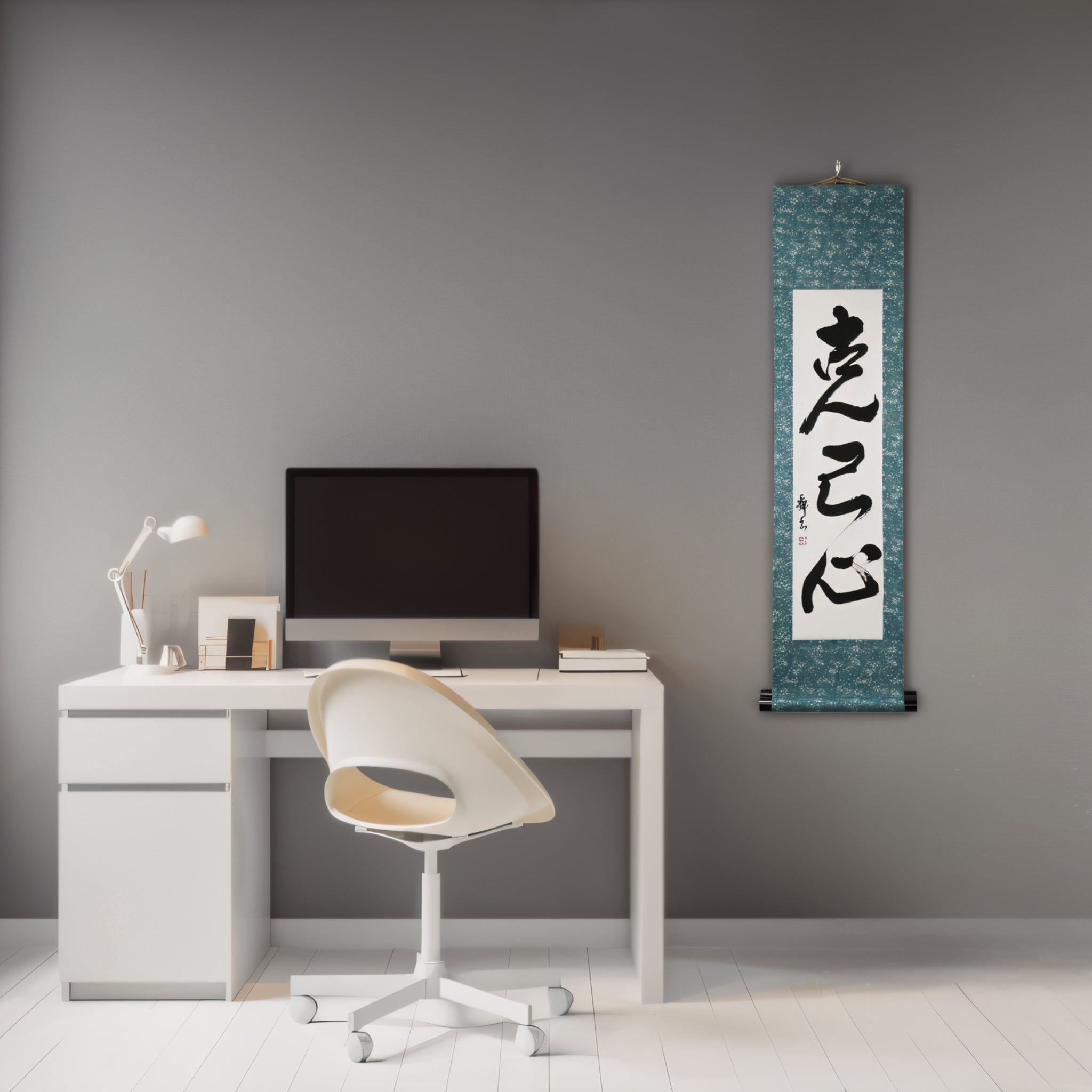 Questo rotolo di calligrafia giapponese presenta il potente termine 克己心 (Kokkishin), che significa "lo spirito dell'autodisciplina". Rappresenta un principio universale nel Karate, Judo e Aikido — l'idea che il più grande avversario è spesso dentro di noi.
