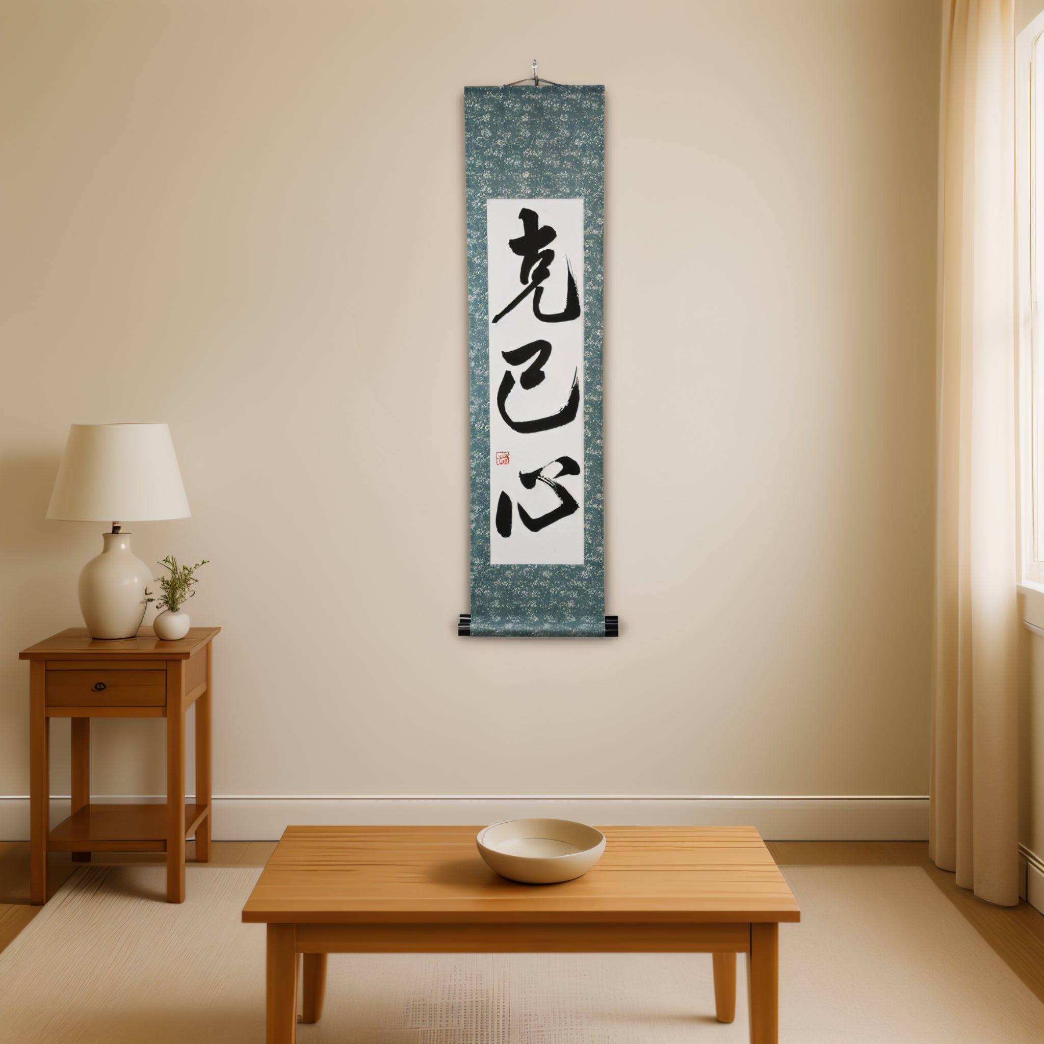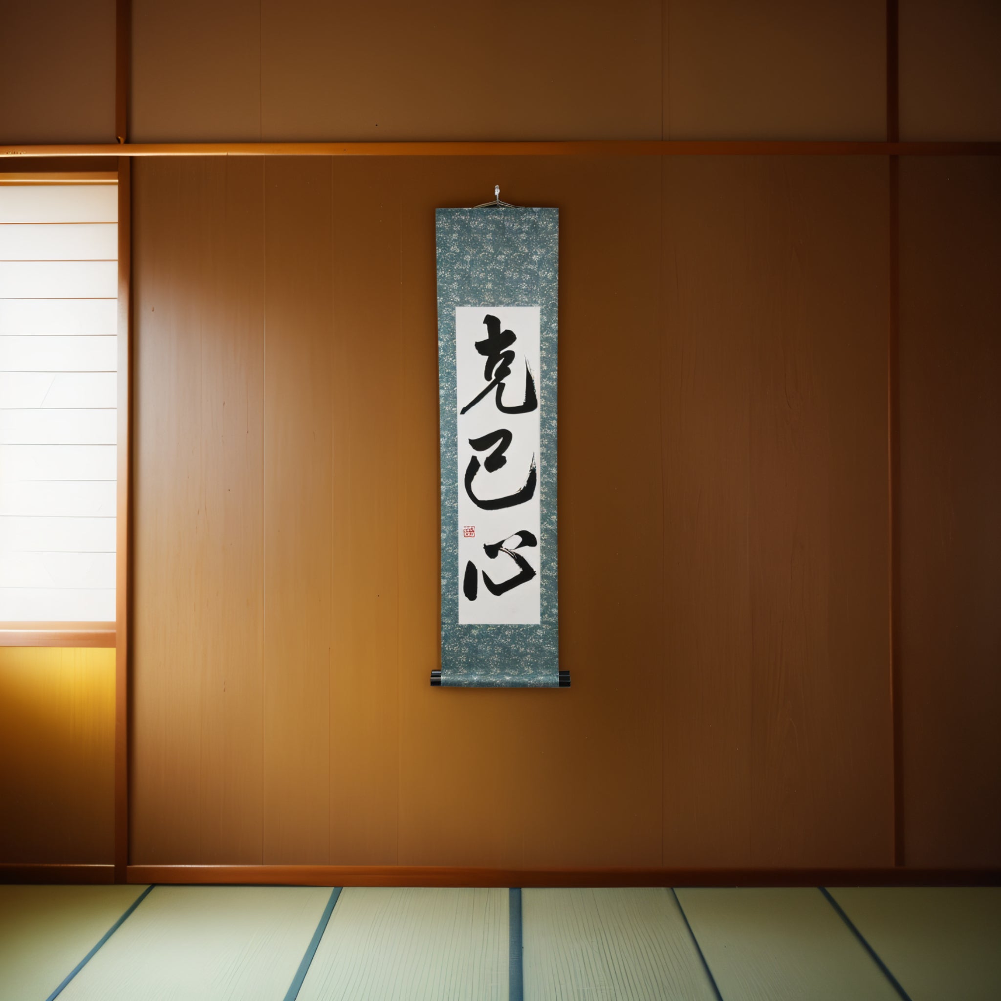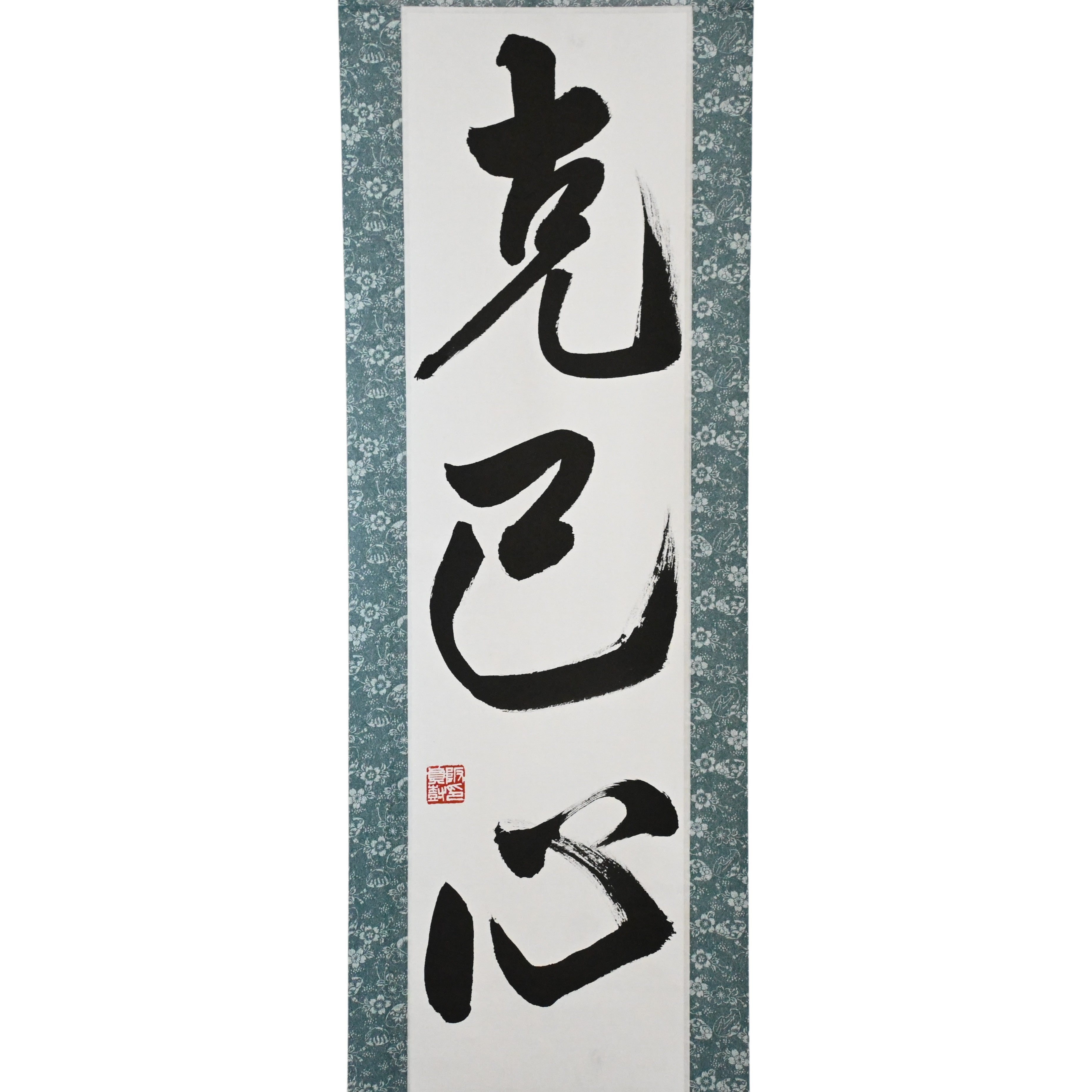 Questo rotolo di calligrafia giapponese presenta il potente termine 克己心 (Kokkishin), che significa "lo spirito dell'autodisciplina". Rappresenta un principio universale nel Karate, Judo e Aikido — l'idea che il più grande avversario è spesso dentro di noi.