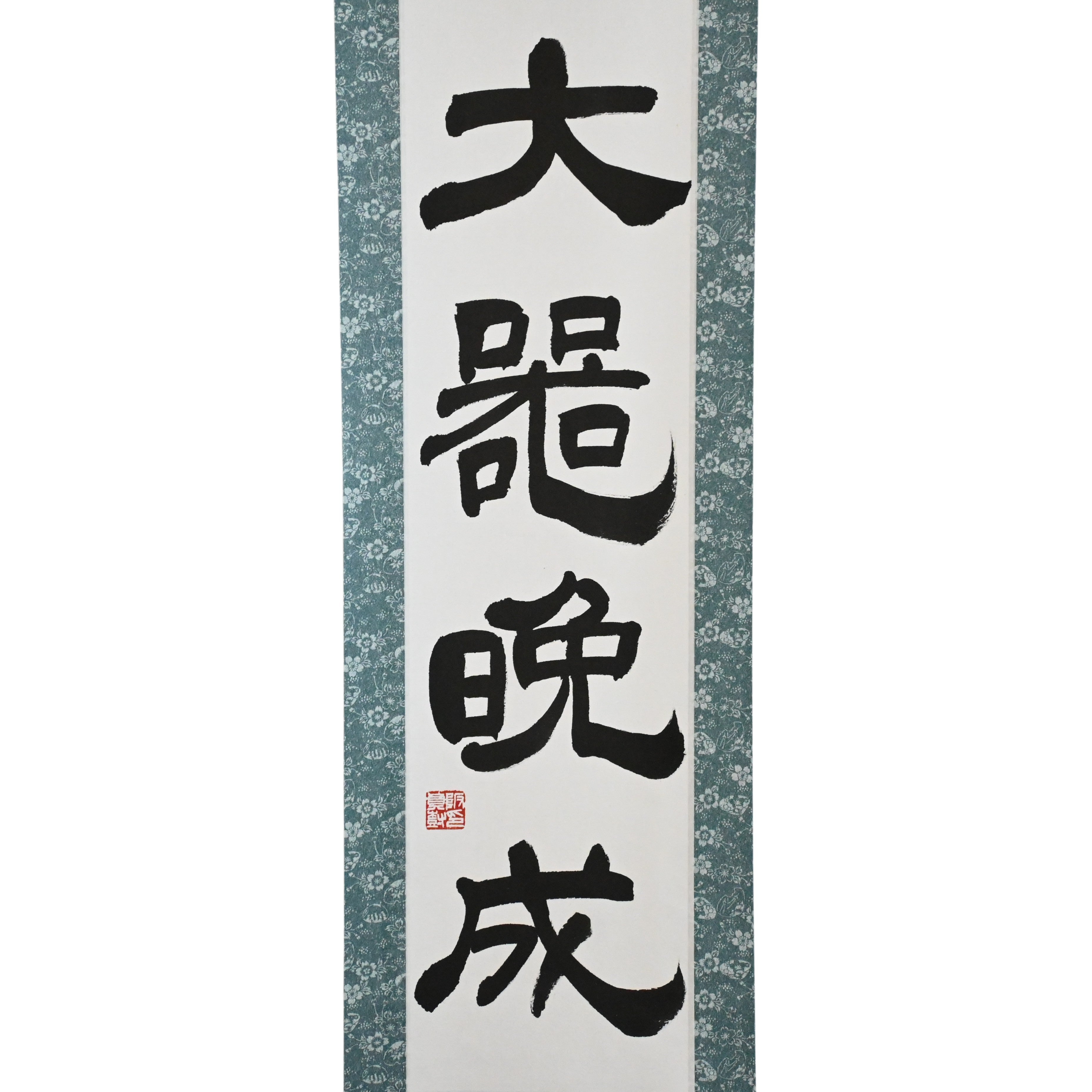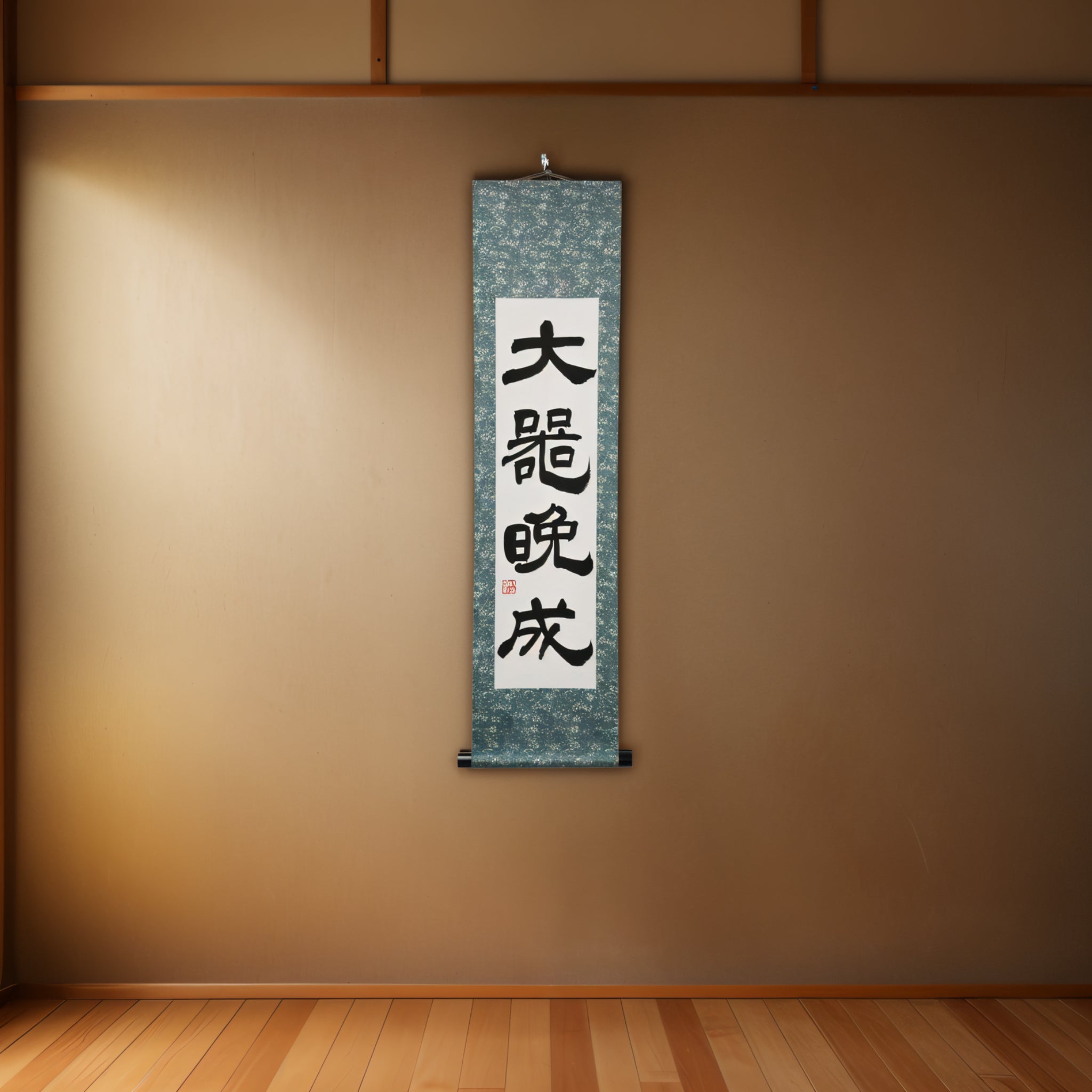 Questo rotolo di calligrafia giapponese presenta la frase senza tempo 大器晩成 (Taiki Bansei) — un'espressione classica radicata nell'antica filosofia asiatica. Letteralmente significa "un grande recipiente si forma lentamente", insegna che la vera grandezza non appare rapidamente. Il talento più profondo, la forza e il carattere si plasmano lentamente, attraverso anni di esperienza, disciplina e crescita interiore.