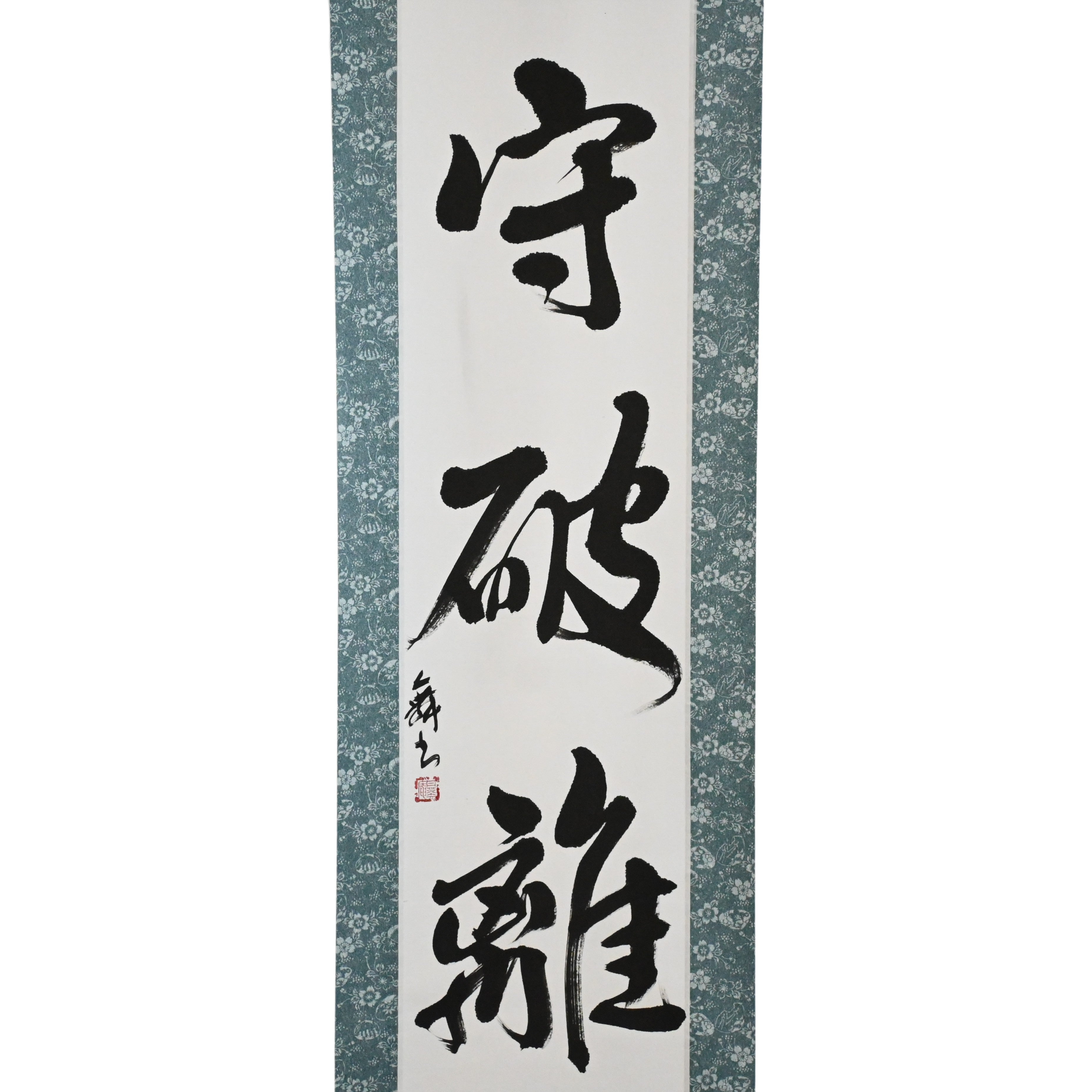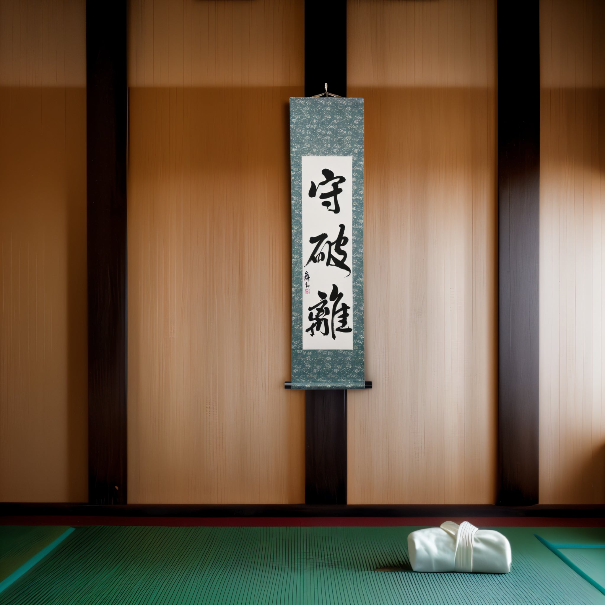 Questo rotolo di calligrafia giapponese presenta la frase senza tempo 守破離 (Shuhari) — un insegnamento profondo che cattura il percorso di crescita e maestria in tutte le arti marziali.