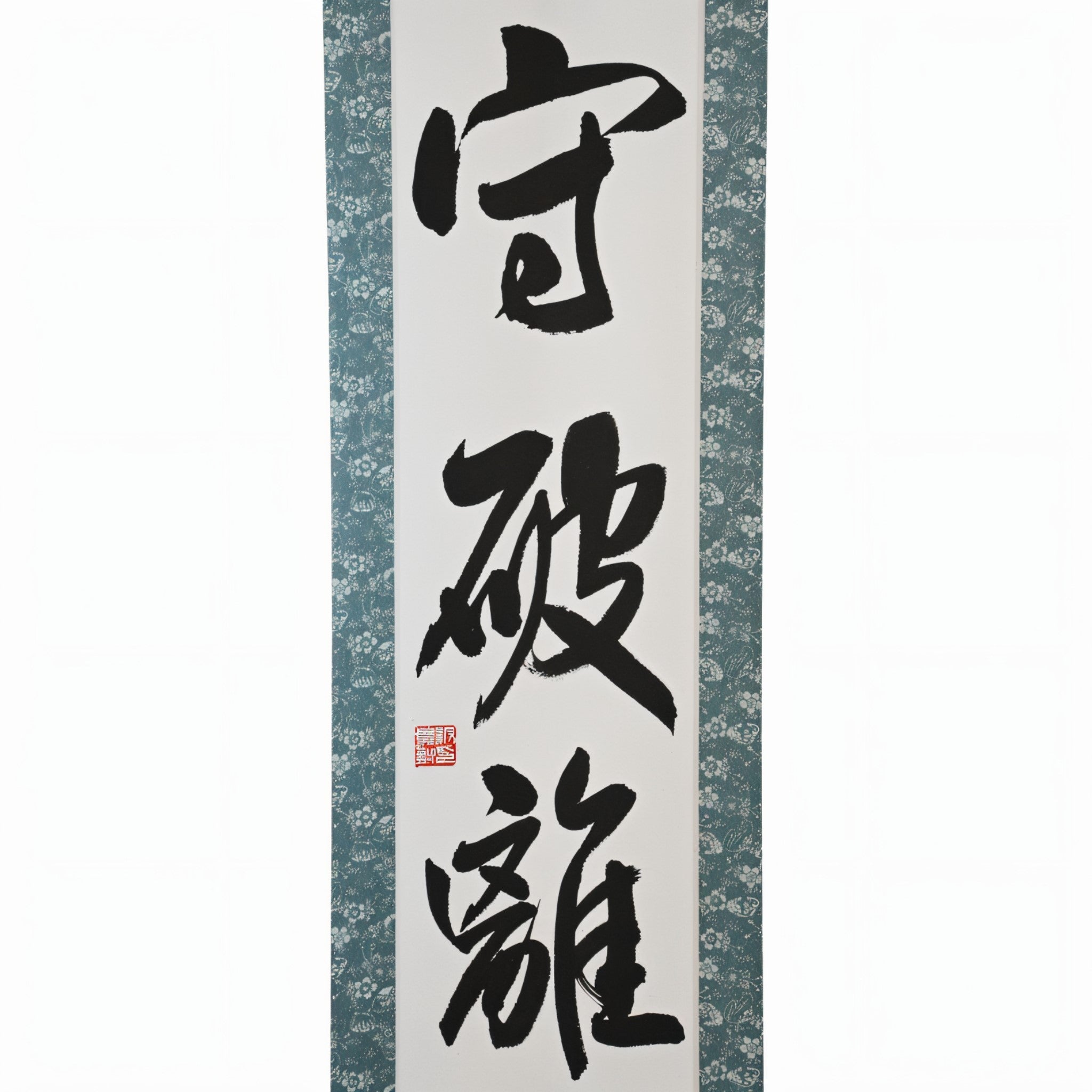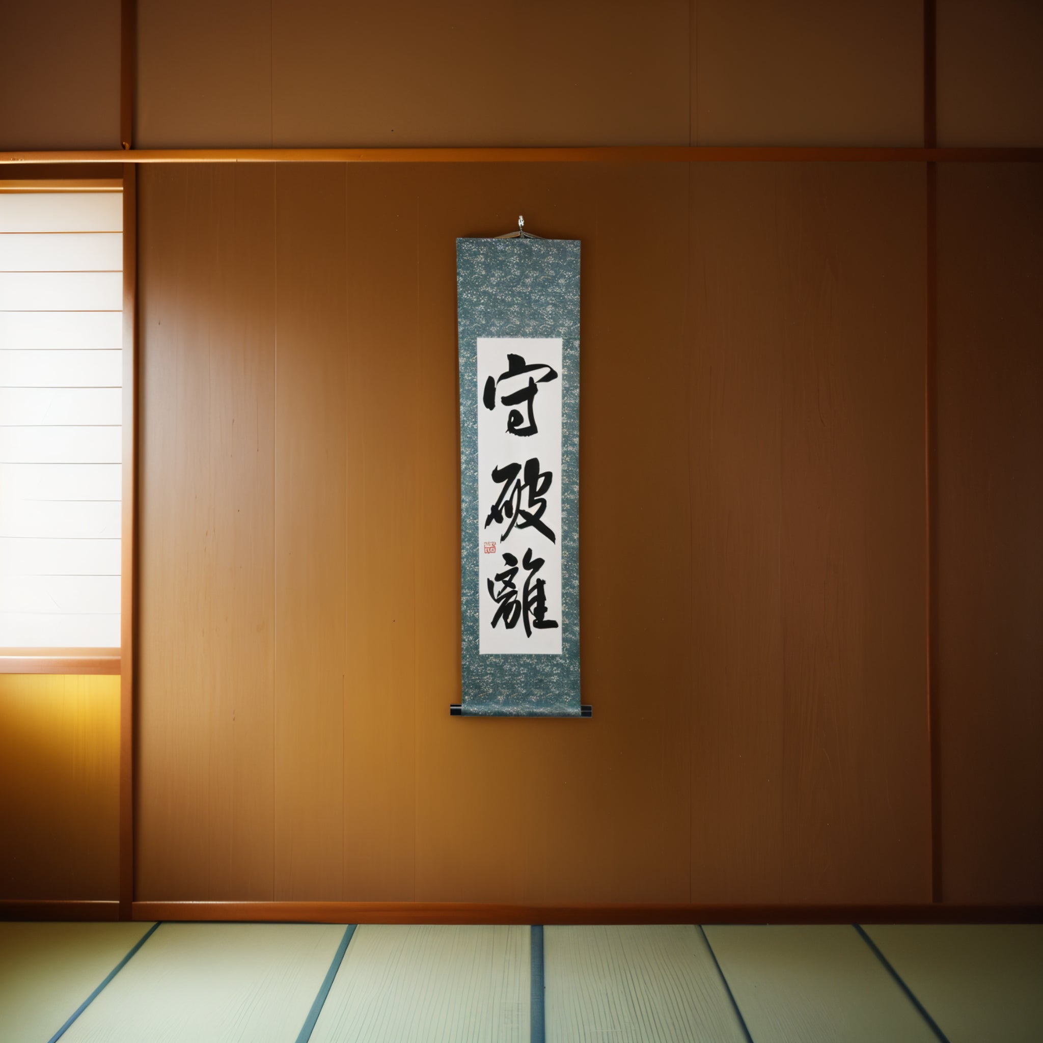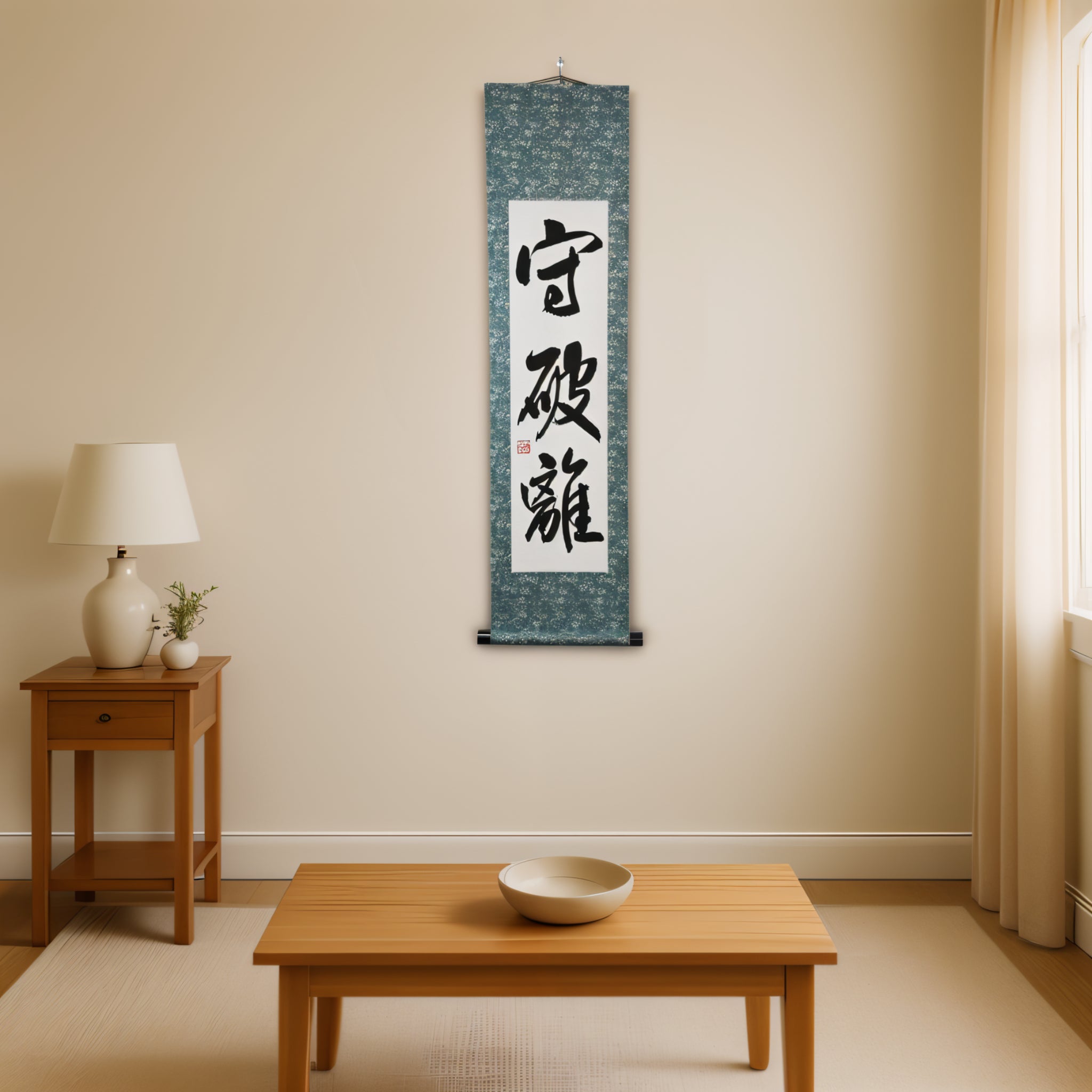 Questo rotolo di calligrafia giapponese presenta la frase senza tempo 守破離 (Shuhari) — un insegnamento profondo che cattura il percorso di crescita e maestria in tutte le arti marziali.