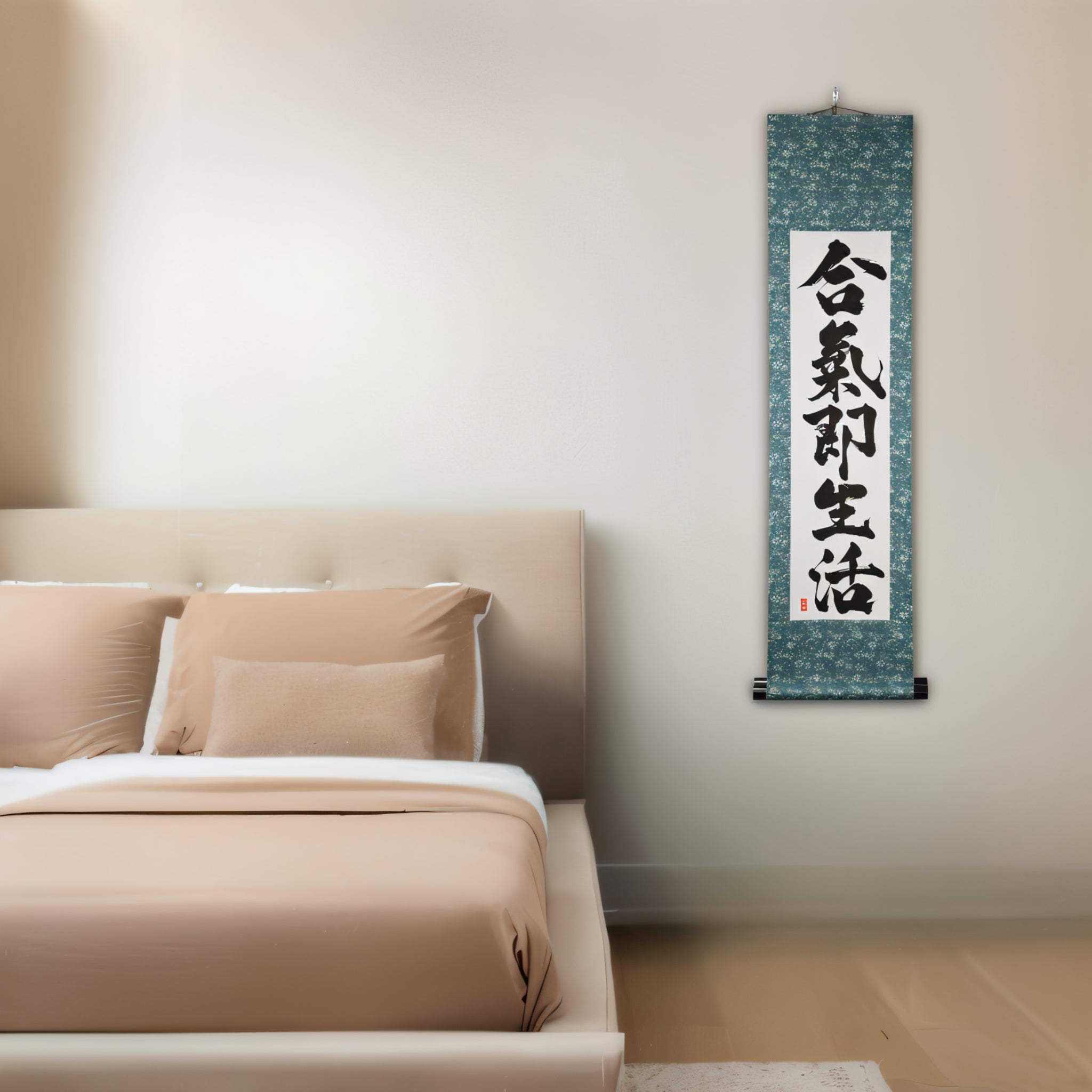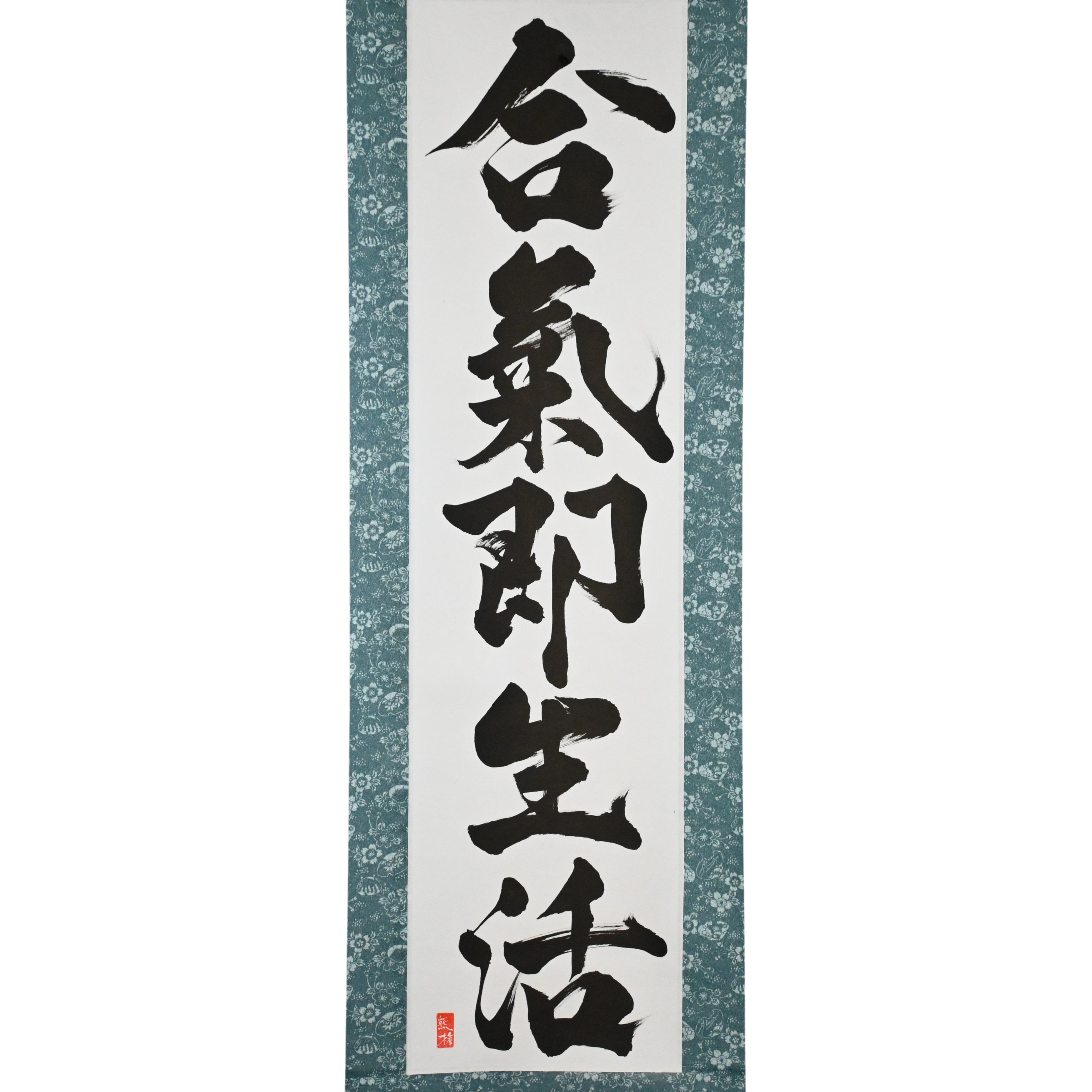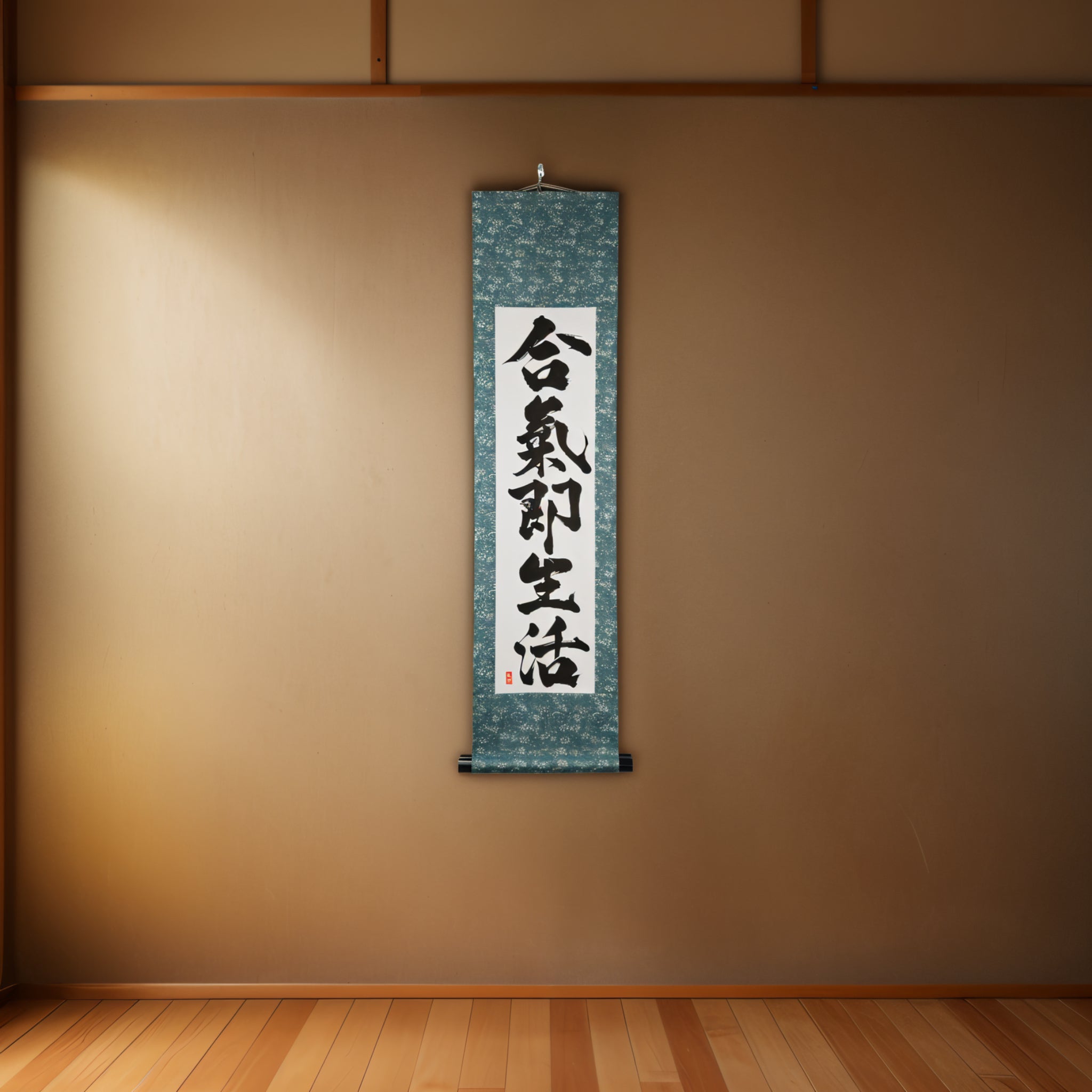 Questo rotolo di calligrafia giapponese presenta la profonda frase 合気即生活 (Aiki Soku Seikatsu) — "L'Aikido è la vita quotidiana". Esprime un principio fondamentale dell'Aikido: l'arte non è confinata al dojo, ma scorre attraverso ogni momento delle nostre vite.