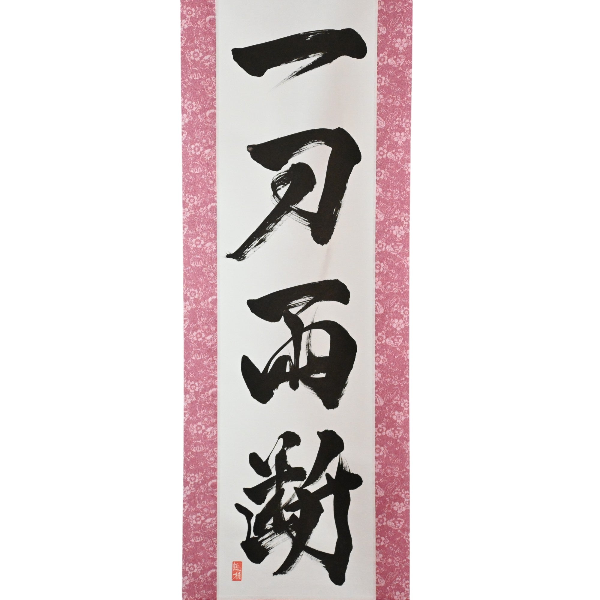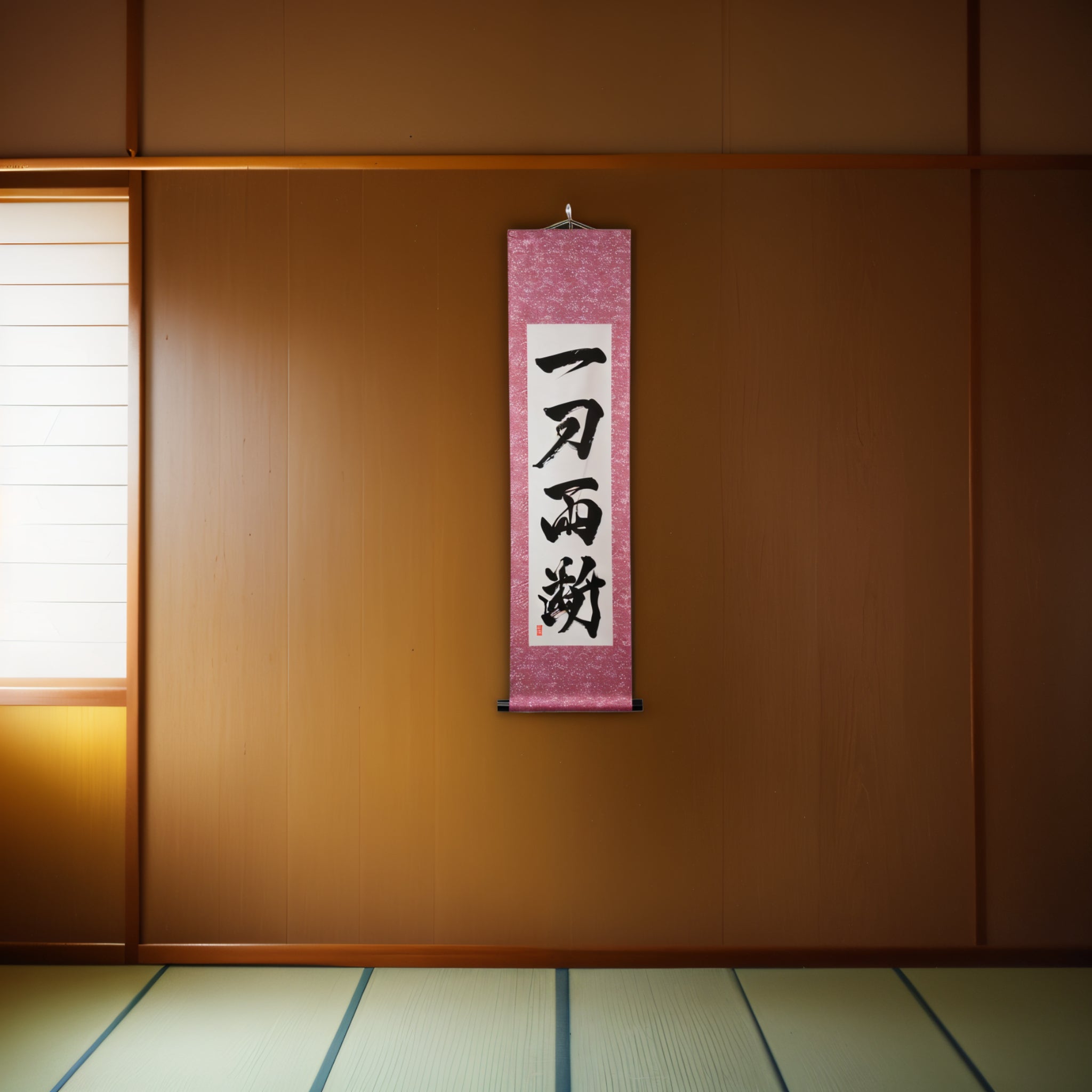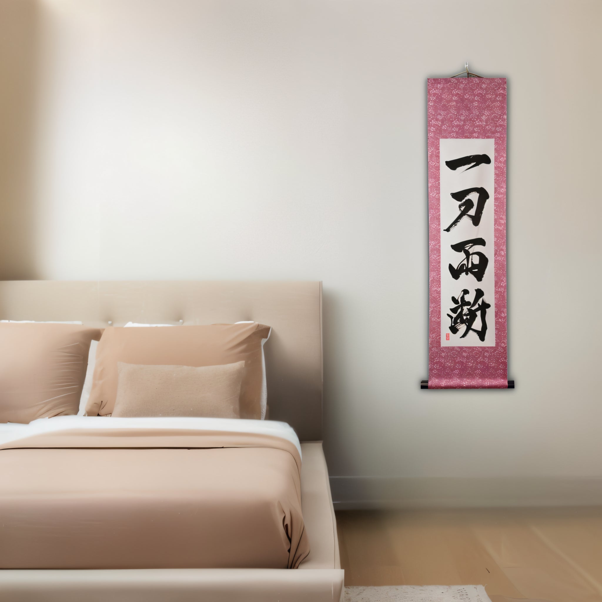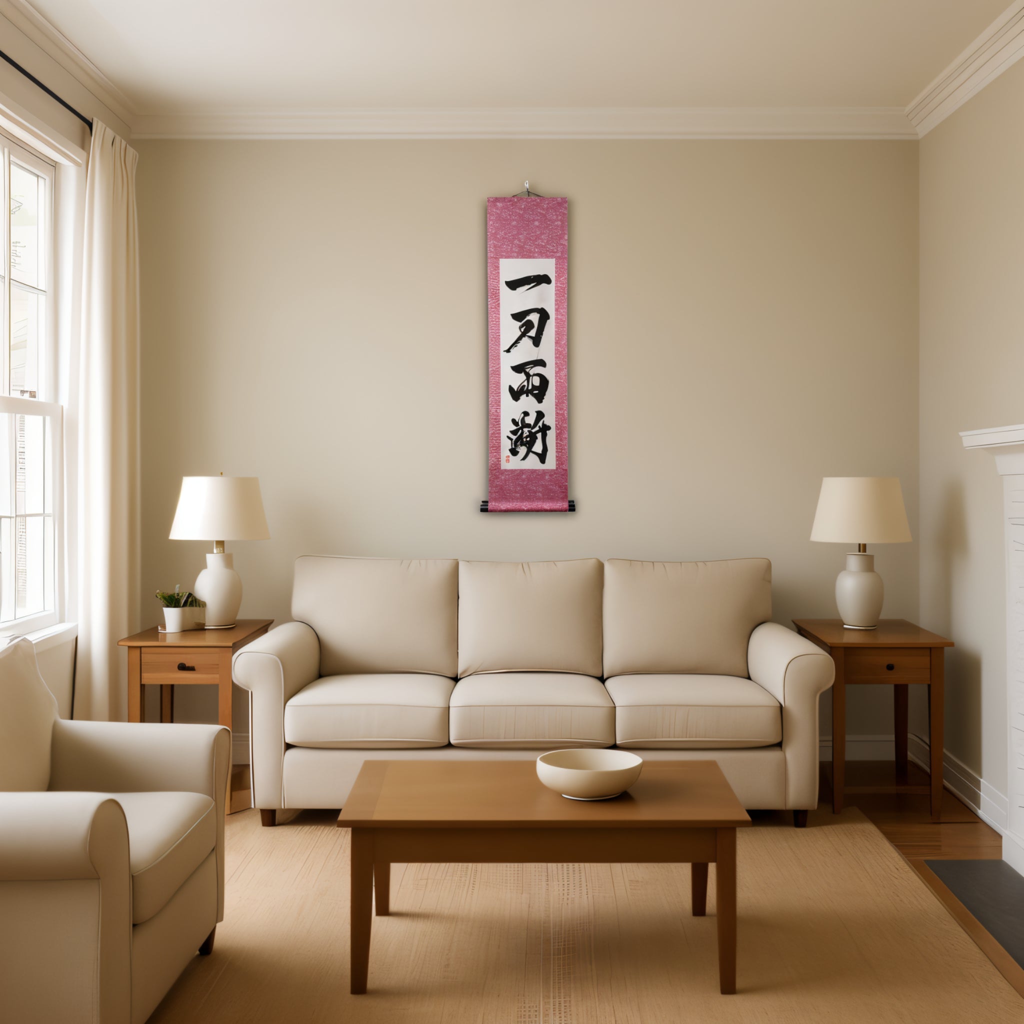 Questo rotolo di calligrafia giapponese mostra con audacia la frase 一刀両断 (Ittō Ryōdan) — un'espressione potente che cattura la decisione incrollabile e la chiarezza dello spirito samurai.
