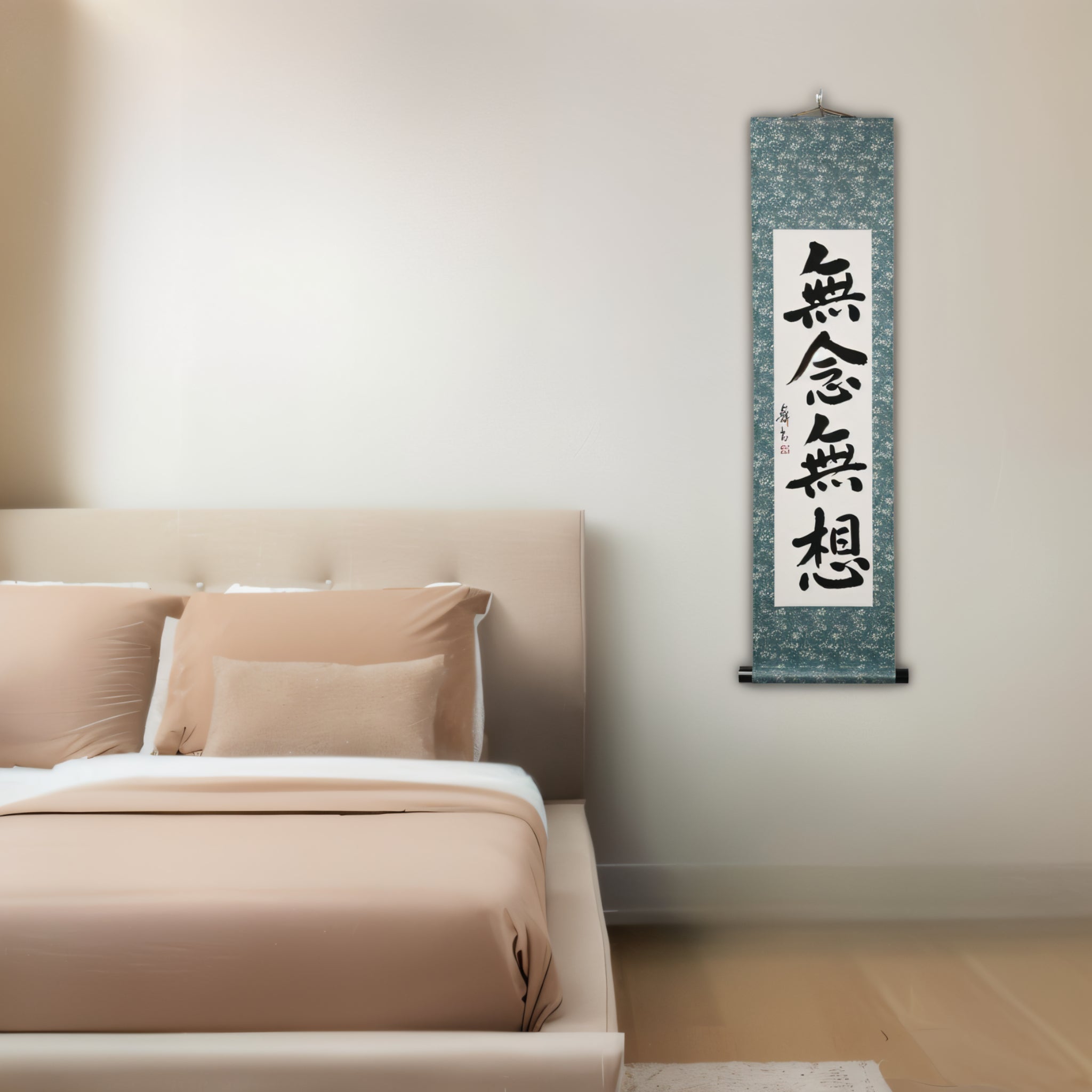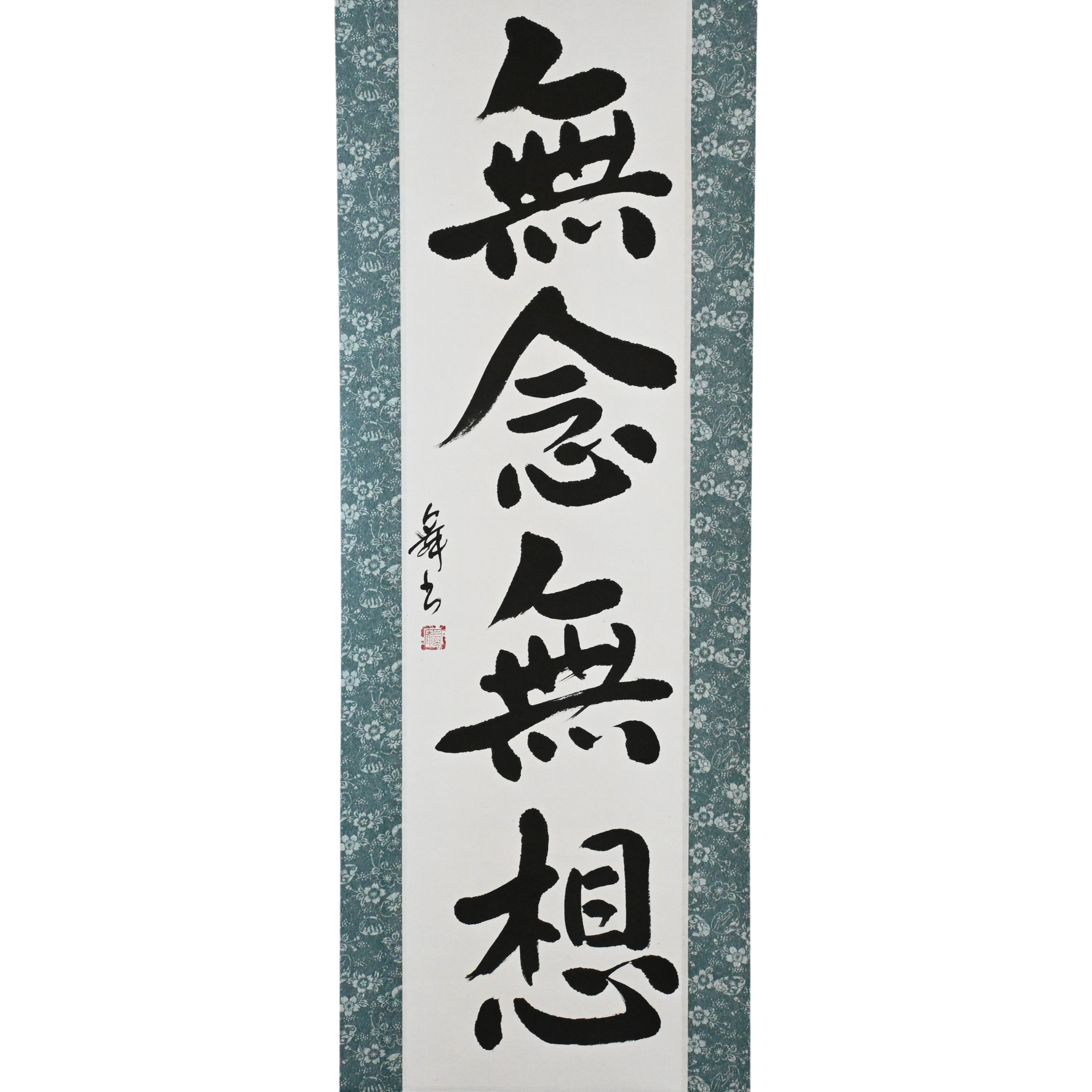 Questo rotolo di calligrafia giapponese presenta il profondo principio 禅 (Zen) 無念無想 (Munen Musō) — uno stato mentale libero da pensieri e distrazioni, fondamentale per la via del Samurai. Radicato sia nella pratica 禅 (Zen) che nel 武士道 (Bushidō), 無念無想 permette al guerriero di agire con pura presenza, rispondendo intuitivamente e decisamente in ogni momento.