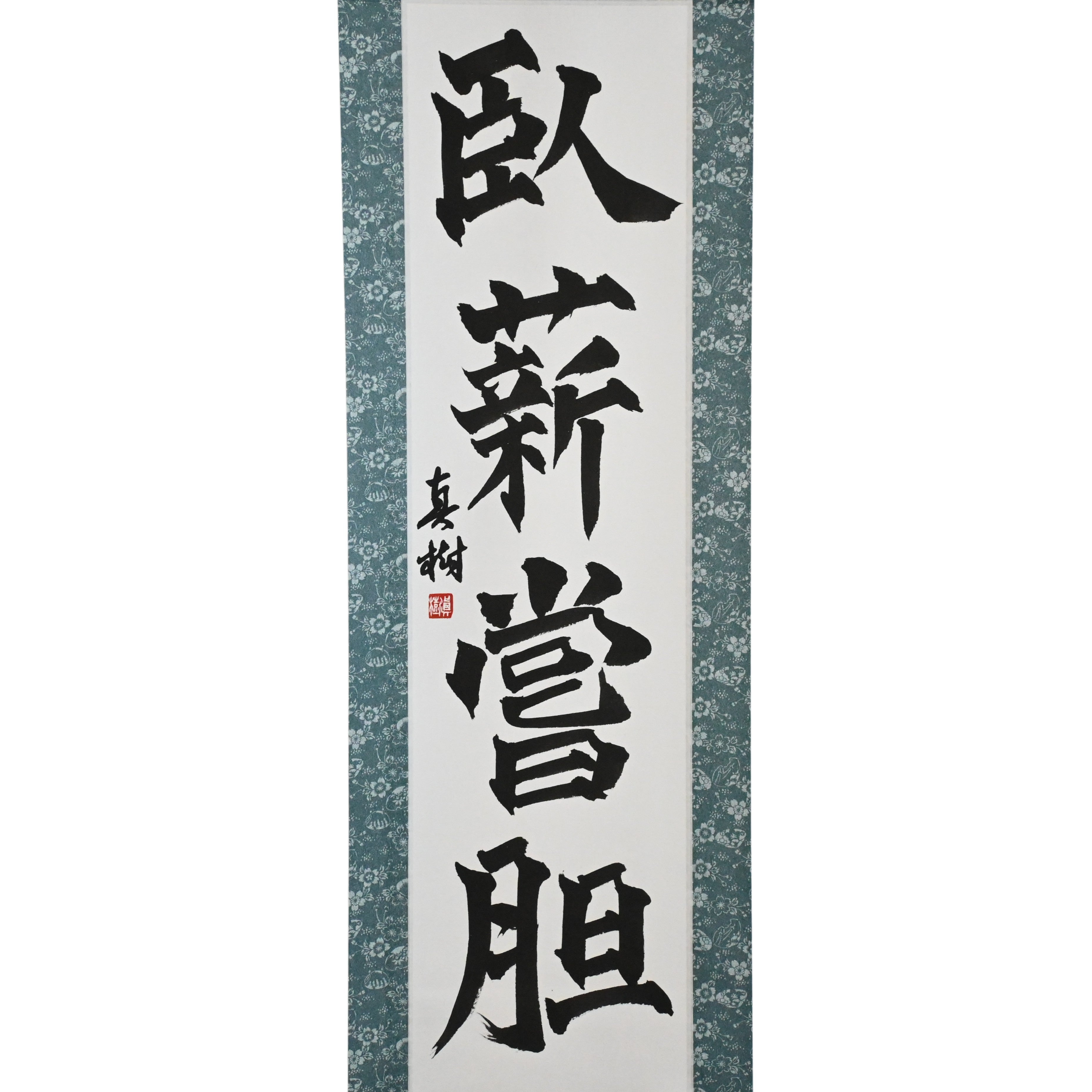 Questo rotolo di calligrafia giapponese presenta la potente frase 臥薪嘗胆 (Gashin Shōtan) — un'espressione senza tempo di pazienza, perseveranza e determinazione silenziosa nel cammino del samurai.
