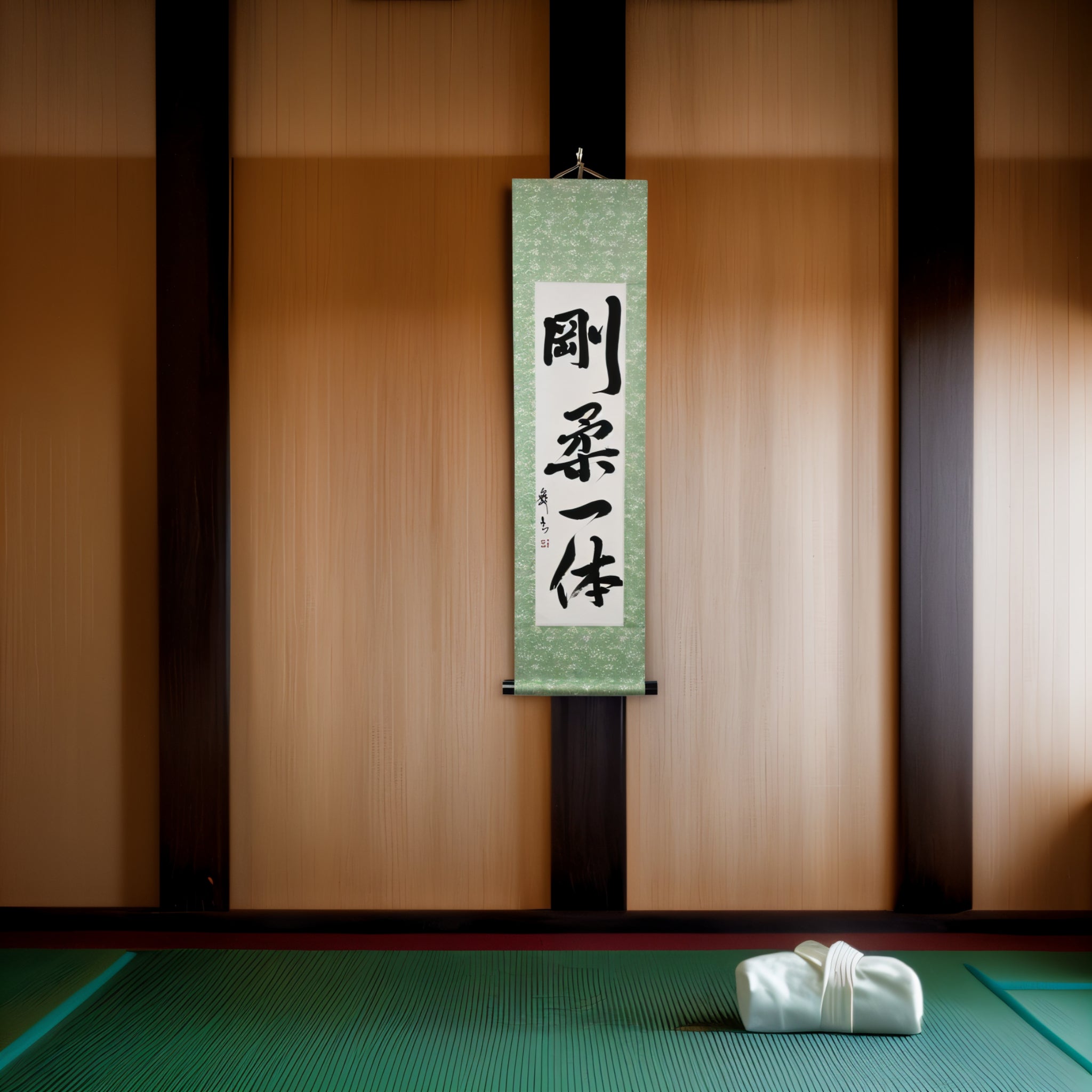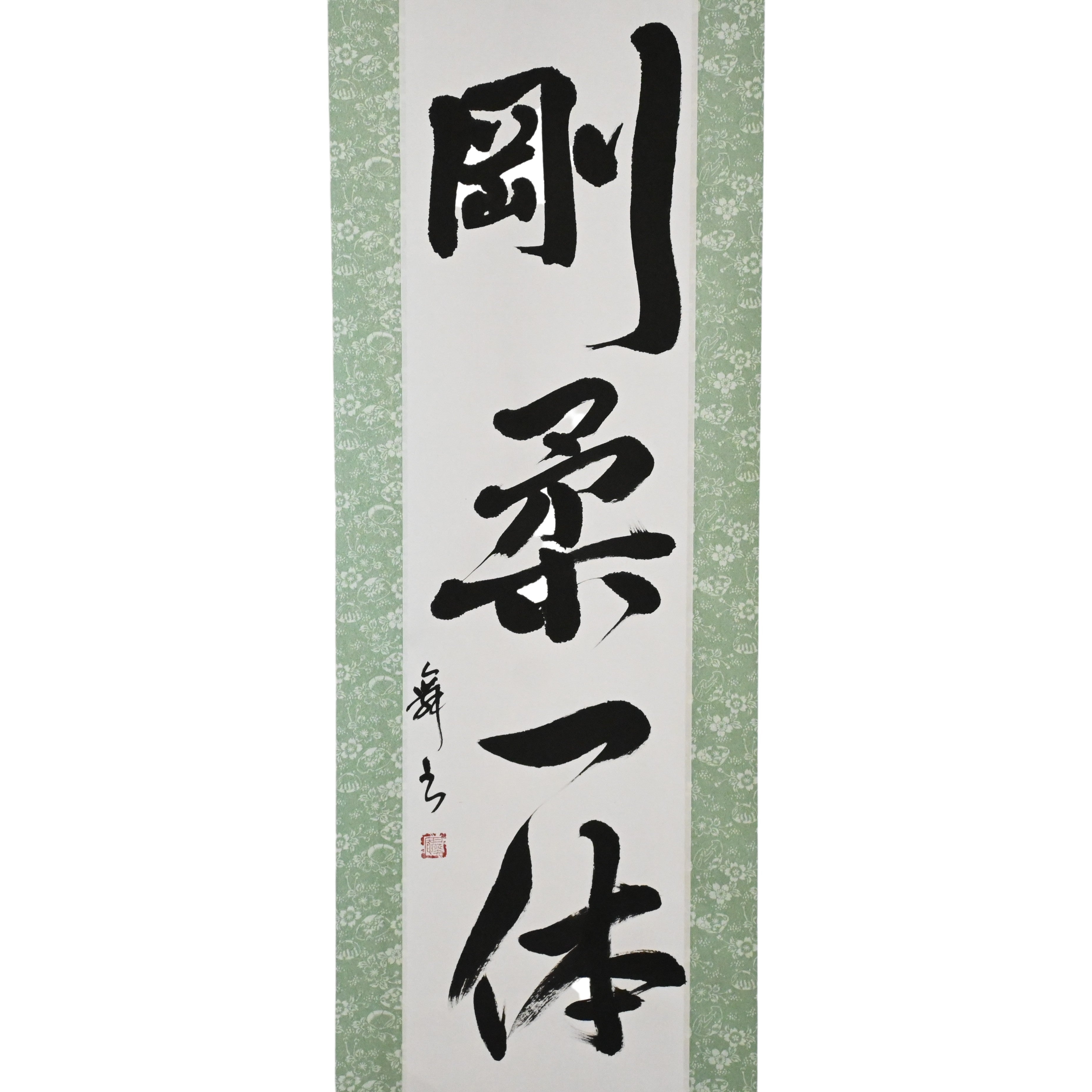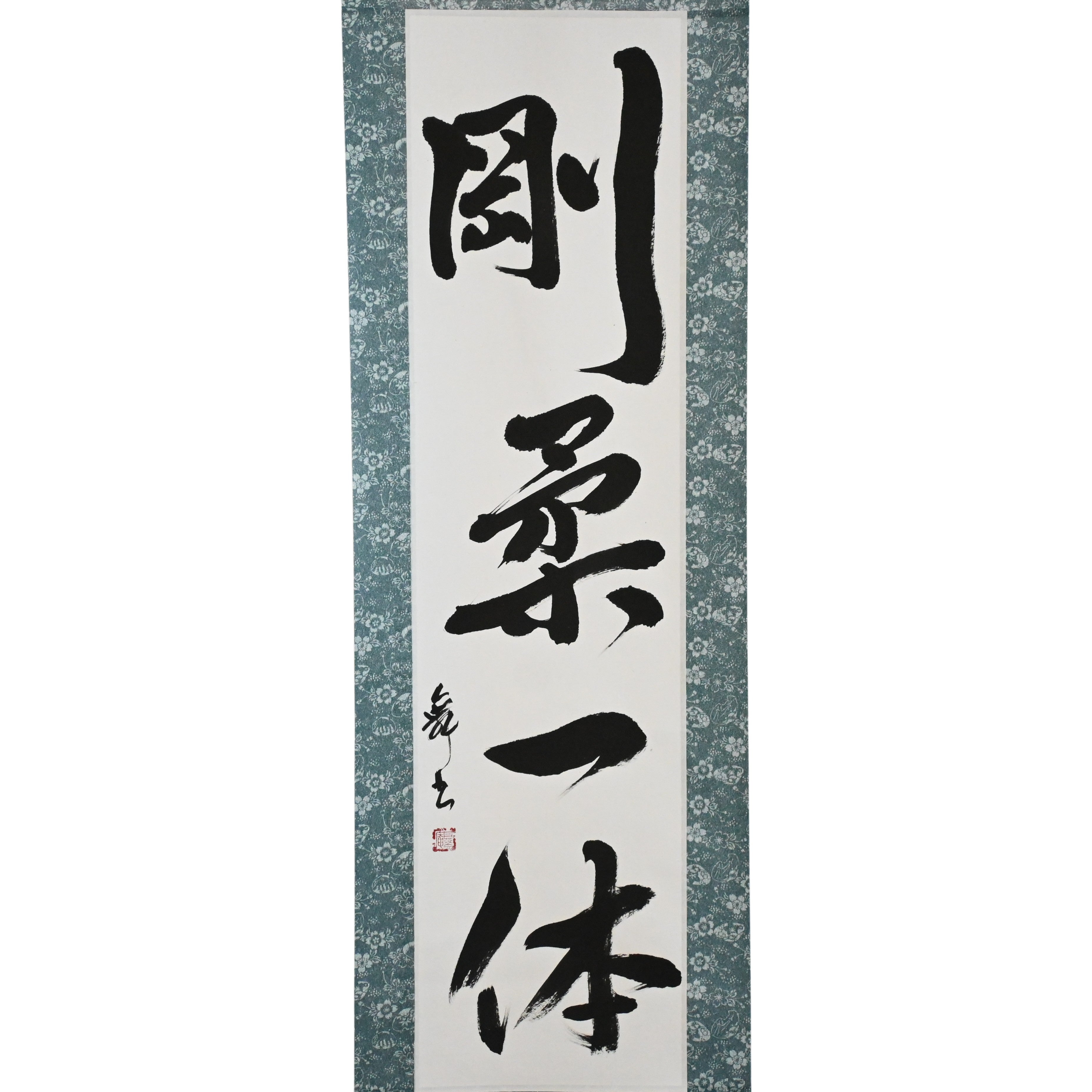 Questo rotolo di calligrafia giapponese presenta la frase 剛柔一体 (Gōjū Ittai) — un concetto profondo che sta al cuore della filosofia del Karate, specialmente nel 剛柔流 (Gōjū-ryū), uno dei suoi stili tradizionali più venerati.