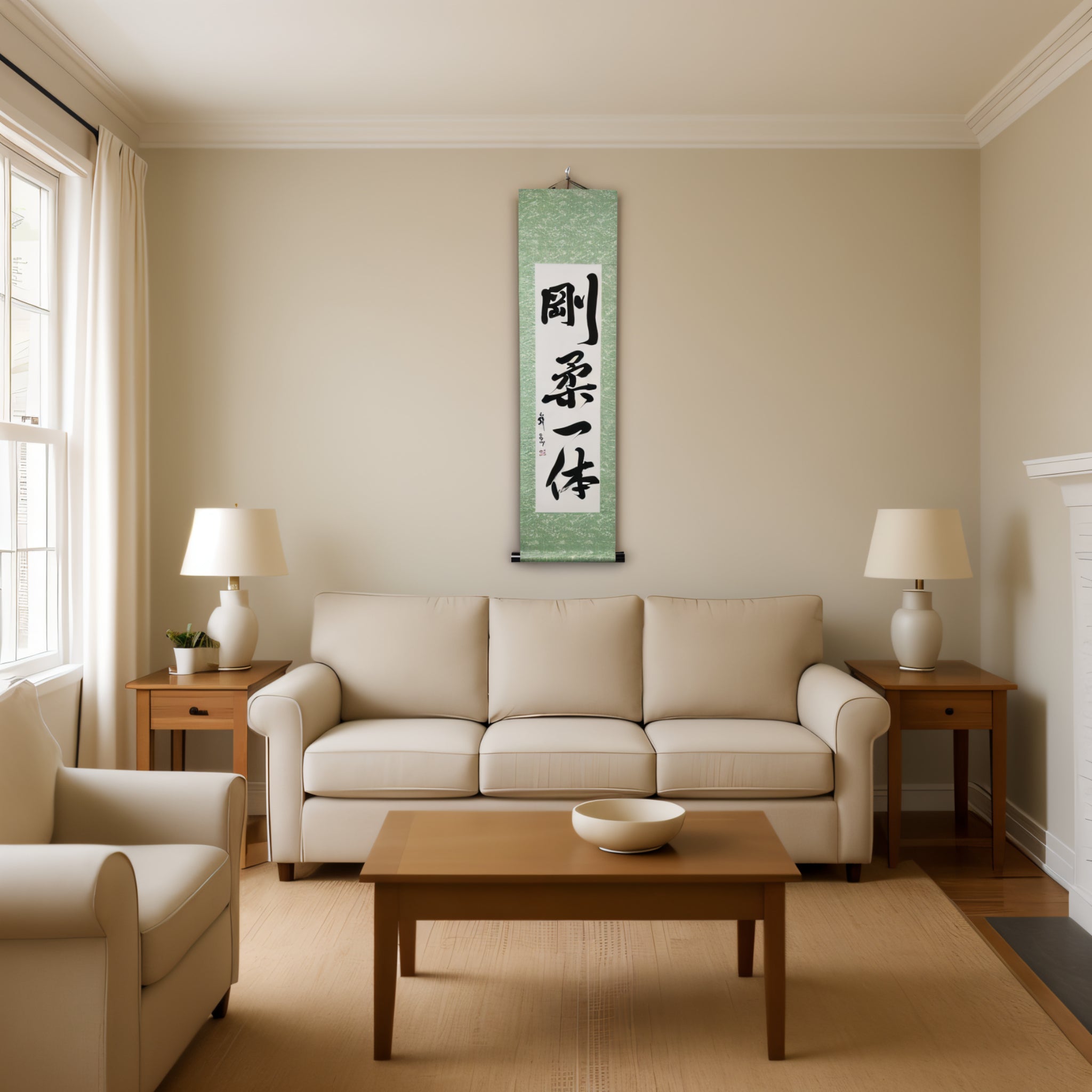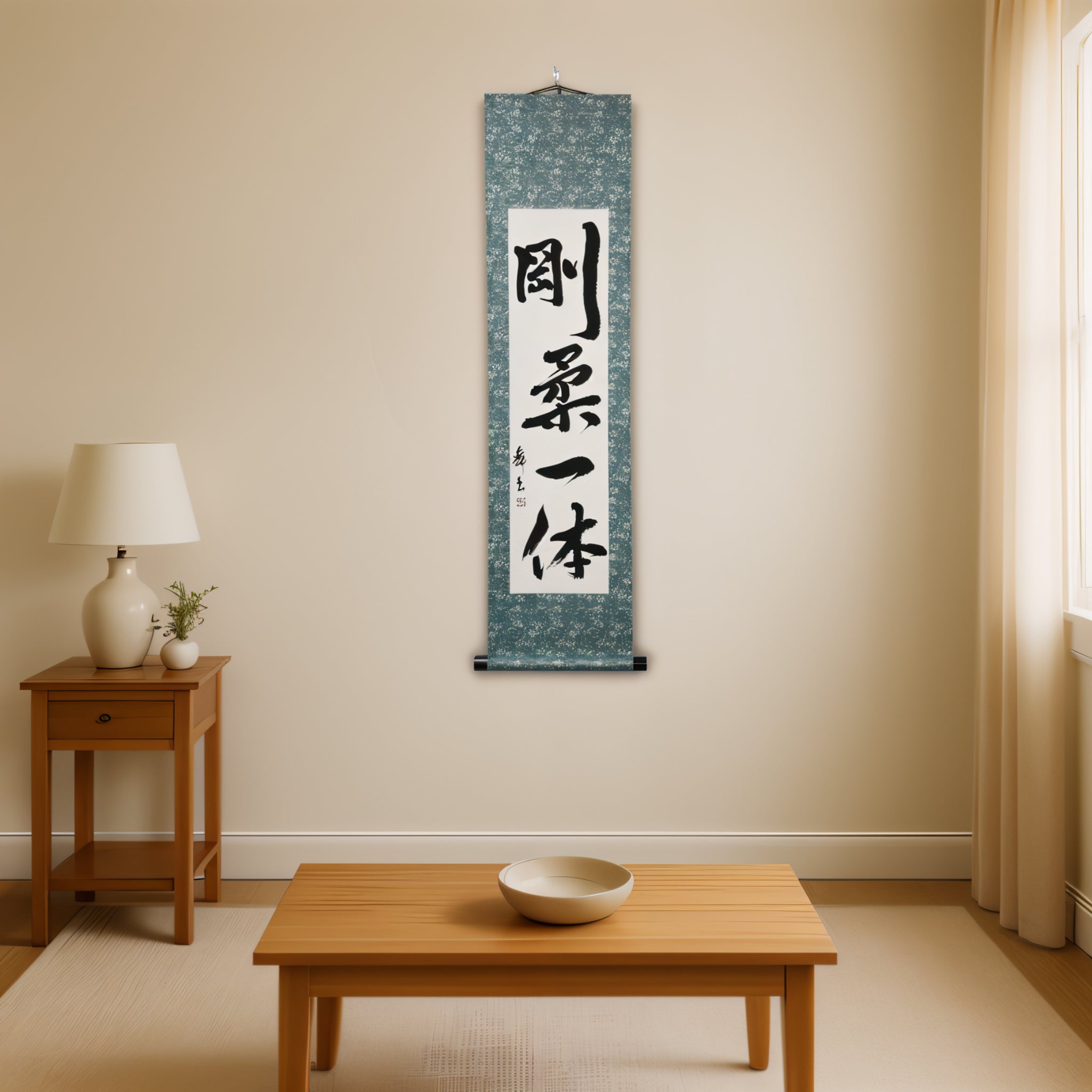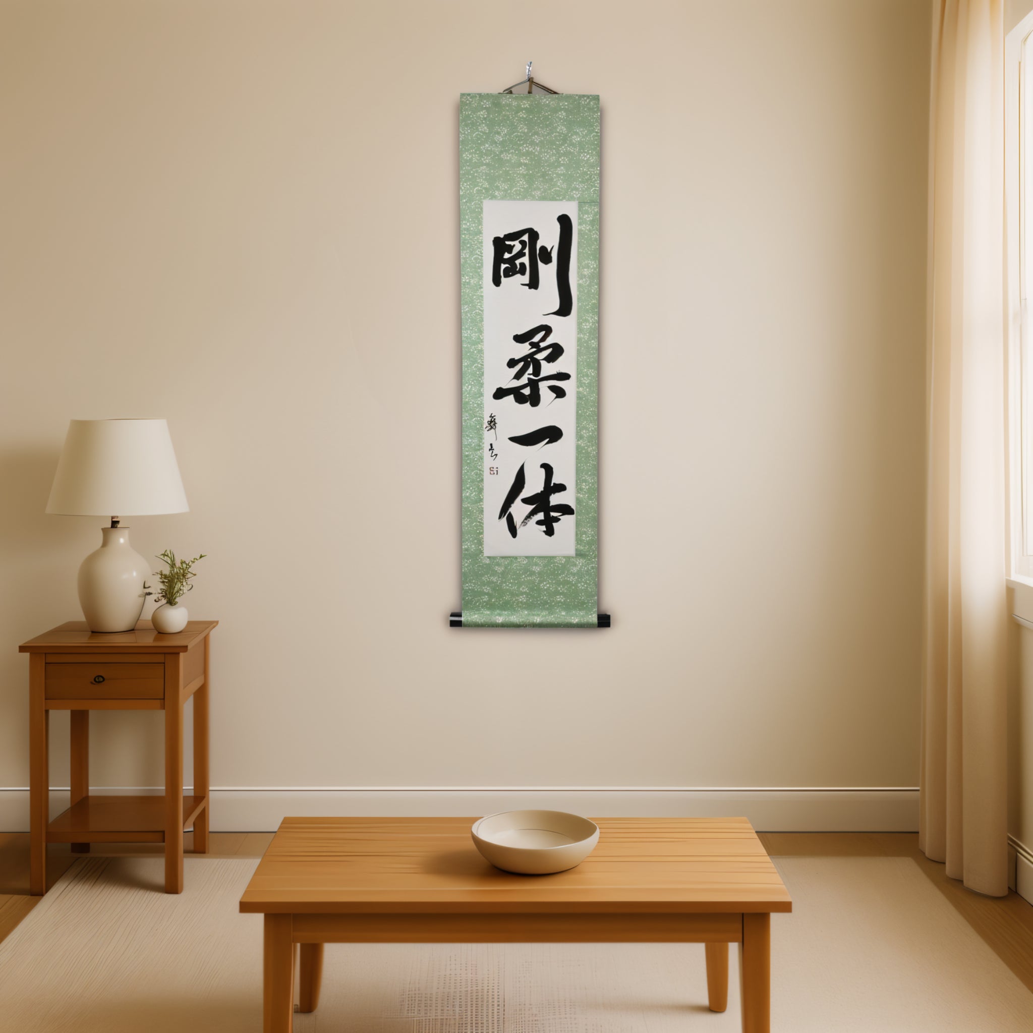 Questo rotolo di calligrafia giapponese presenta la frase 剛柔一体 (Gōjū Ittai) — un concetto profondo che sta al cuore della filosofia del Karate, specialmente nel 剛柔流 (Gōjū-ryū), uno dei suoi stili tradizionali più venerati.